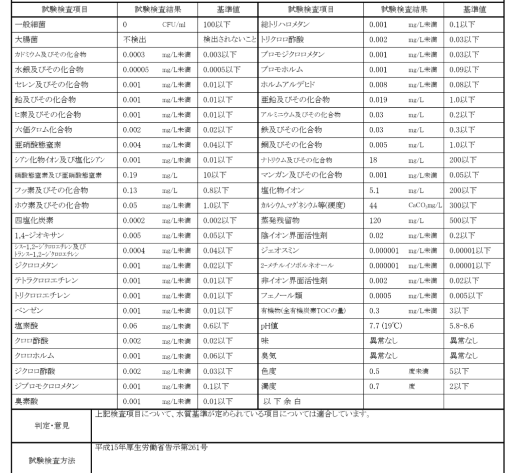 | 主な検査内容 | 一般細菌、大腸菌、重金属、有機物、pHなど | 26項目+さらに細かい化学物質・農薬など |